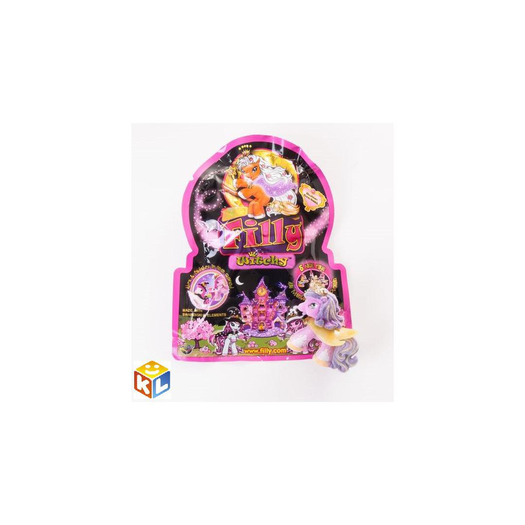 До открытия упаковки невозможно узнать, какая лошадка внутри. Всего в коллекции Filly Witchy – 27 лошадок, включая двух эксклюзивных. Каждая лошадка Филли Ведьма из этих наборов - обладательница волшебного плаща, который светится в темноте. Плащи украшены кристаллами Сваровски разных цветов, на голове у лошадок колдовские остроконечные шляпы.