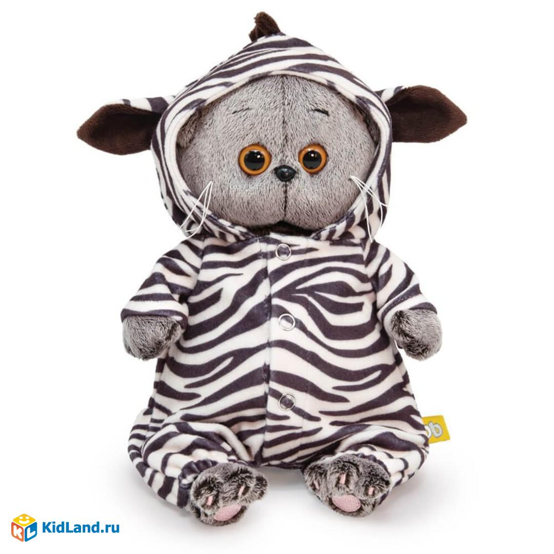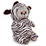 Малыш Басик в очень необычном комбинезончике в виде маленькой зебры. Комбинезон сшит из мягкого софта с animal принтом на кнопках спереди и капюшоном с ушками. Игрушка поставляется в закрытой подарочной коробке, подвязанной атласными лентами.