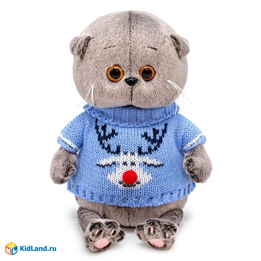 Очень забавный образ малыша Басика в голубом вязаном свитере, на котором вывязан белый олень с красным помпоном вместо носа.