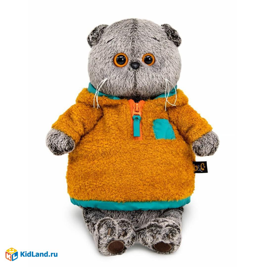 Кот Басик в стильном анораке из короткого мягкого меха цвета жжённой карамели. Анорак сшит с капюшоном, с накладным карманчиком из болоньевой ткани цвета бирюзы и с оранжевой зип-молнией спереди. Капюшон и низ анорака отделаны бирюзовой болонью.