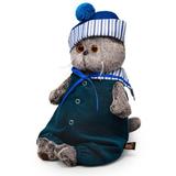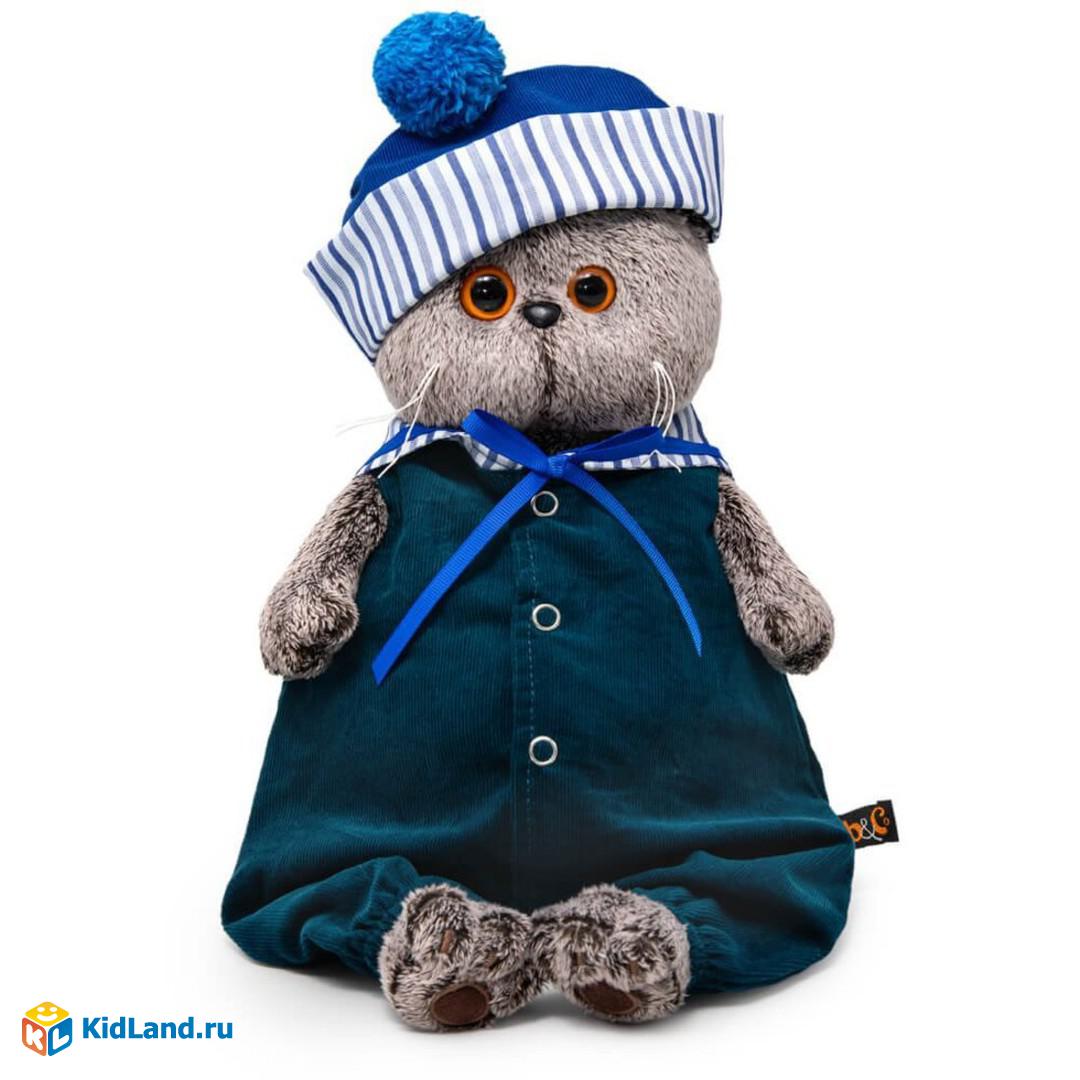 Кот Басик в уютном комплекте в морском стиле. На Басике вельветовый комбинезон цвета морской глубины, спереди с застежкой на кнопки, морской воротник «Гюйс» с завязкой на бант, морская шапочка с полосатым отворотом и помпоном. Игрушка поставляется в закрытой подарочной коробке, подвязанной атласными лентами.