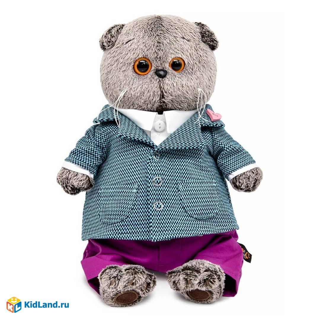 Кот Басик в суперстильном костюме. На нём пиджак из жаккардового трикотажа цвета воды с мелким графичным орнаментом. Пиджак сшит с английским воротником, накладными карманами и застёжкой на кнопки. На лацкане пиджака трогательный аксессуар – брошка-пуговица в виде розового сердечка. Также на Басике классические брюки из плотной пурпурной ткани и белоснежная хлопковая манишка.