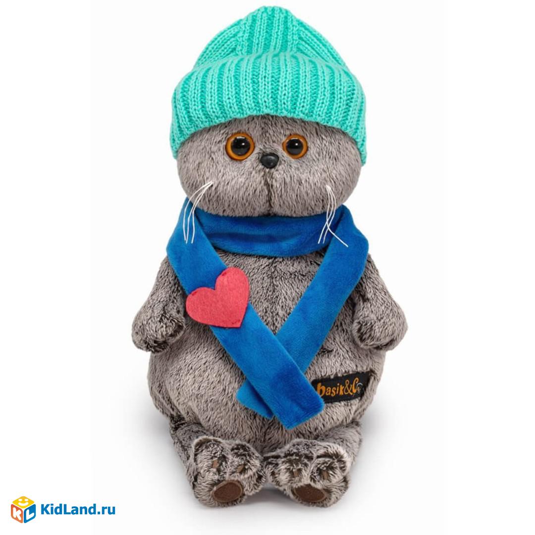 Кот Басик в теплом комплекте, состоящем из бирюзовой вязаной шапочки и длинного шарфика из мягкого софта цвета морской воды. Шарфик украшен алым сердечком из фетра. Игрушка поставляется в закрытой подарочной коробке, подвязанной атласными лентами.