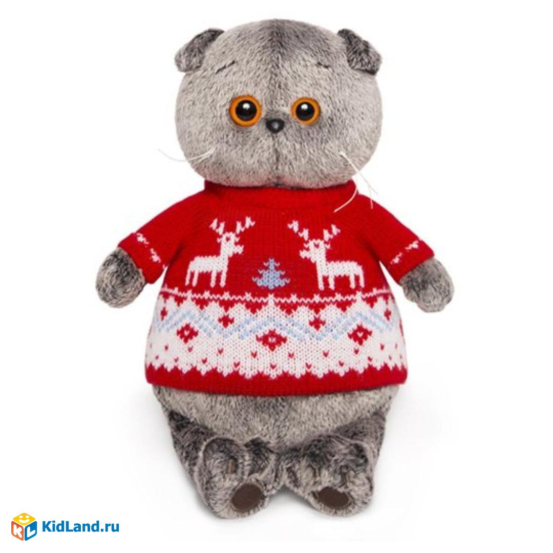 Милый котёнок Басик понравится и мальчику, и девочке! Этот очаровательный малыш очень озорной и весёлый: он просто обожает, когда с ним играют и берут его с собой в гости, любит ласку, любовь и внимание. У котика мягкая плюшевая шёрстка роскошного дымчато-серого цвета, симпатичная мордочка с большими глазками и коричневые подушечки на лапках. На котёнке - традиционный новогодний свитер с белым принтом и оленями.