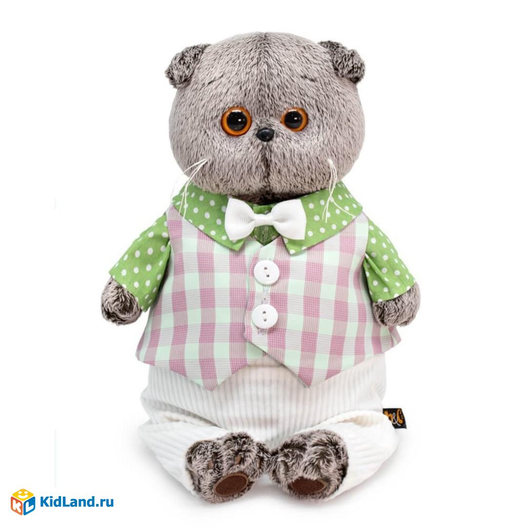 Кот Басик в невероятно красивом костюмчике в светлых тонах. Костюмчик можно надеть для встречи гостей, например, у себя на даче. Неспешно выпить вкусного чая за милой беседой. В комплекте: вельветовые белые брючки, зеленая хлопковая рубашечка в белый горошек и жилет в клеточку на белых пуговицах. А также неизменная бабочка из кипенно‑белой сутажной ленты. Игрушка поставляется в закрытой подарочной коробке, подвязанной атласными лентами.