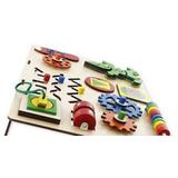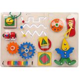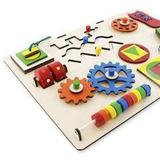 Бизиборд – развивающая доска для детей, представляет собой деревянную панель с закрепленными на ее поверхности различными игровыми элементами(счеты, шестеренки,шнуровка, вкладыши, бегунок).В процессе игры ребенок развивает моторику пальцев, мышление и логику.