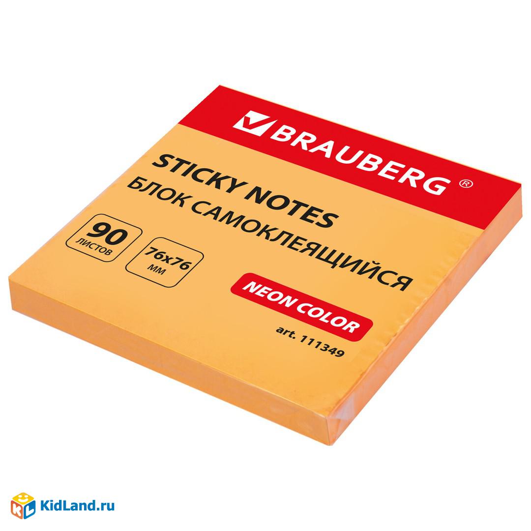 Блок самоклеящийся (стикеры) BRAUBERG НЕОНОВЫЙ 76х76 мм, 90 листов, оранжевый, 111349