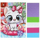 С помощью красочной картонной основы и разноцветных мягких элементов юная художница сможет самостоятельно создать необычную аппликацию с изображением милой белой кошечки с розовым бантиком. Готовую поделку можно подарить близким или использовать для украшения интерьера.