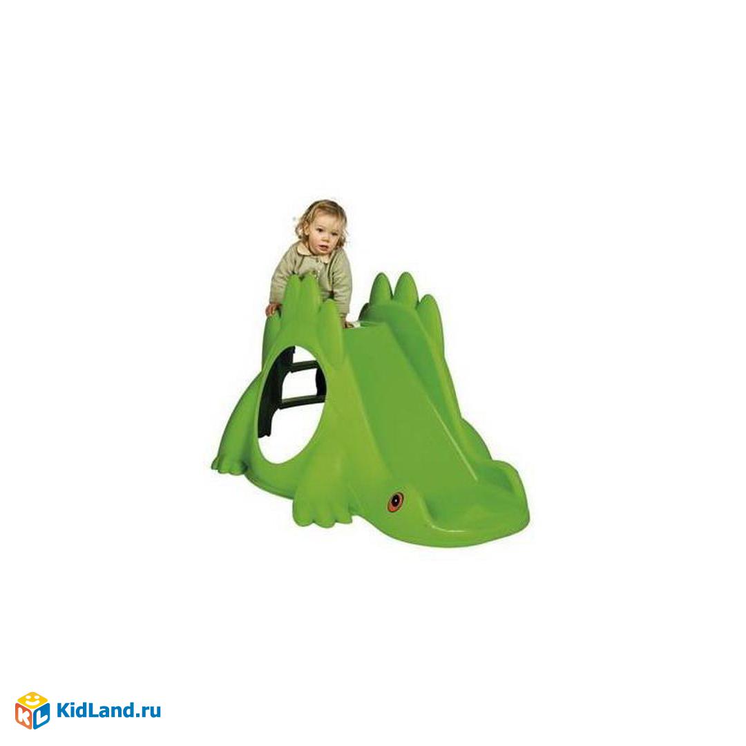 Красочная зеленая горка-динозавр стоит на четырех крепких лапах. Для безопасности катания предусморен удобный изгиб для плавного замедления, а также невысокие бортики по краям спуска в виде округлых шипов на спине динозавра. Внутри расположен уютный домик с двумя окошками. Горку можно использовать и на улице, и дома. Размер: 115*91,5*68 см. Возраст от 1 до 3 лет.