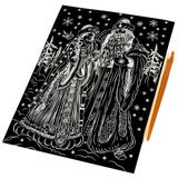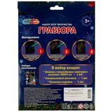 С помощью данного набора юный художник сможет создать эффектную новогоднюю картину на чёрном фоне. Контур рисунка уже нанесён на основу, остаётся только процарапать изображение специальным штихелем. Можно не повторять каждую черточку, главное - соблюдать направление штриха! Готовая поделка станет отличным вариантом для подарка близким или для украшения интерьера комнаты.