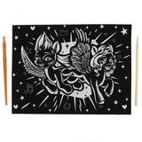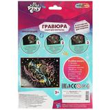С помощью данного набора юный художник сможет создать эффектную картину с героями популярного мультсериала на чёрном фоне. Контур рисунка уже нанесён на основу, остаётся только процарапать изображение специальным штихелем. Можно не повторять каждую черточку, главное - соблюдать направление штриха! Готовая поделка станет отличным вариантом для подарка близким или для украшения интерьера комнаты.