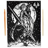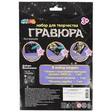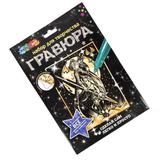 С помощью данного набора юный художник сможет создать эффектную золотистую картину на чёрном фоне. Контур рисунка уже нанесён на основу, остаётся только процарапать изображение специальным штихелем. Можно не повторять каждую черточку, главное - соблюдать направление штриха! Готовая поделка станет отличным вариантом для подарка близким или для украшения интерьера комнаты.
