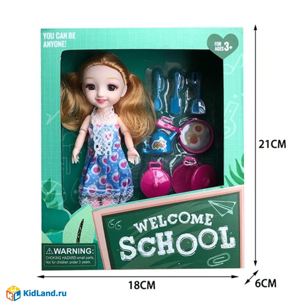 Девочка любит играть в куклы? Тогда ей точно приглянется игровой набор «Хозяюшка»! Прекрасная куколка представлена в милом платьице. У неё очаровательное личико и большие выразительные глазки, шелковистые волосы пшеничного цвета. В комплекте с куклой прилагается 7 игровых кухонных аксессуаров: 2 кастрюли, чайник, сковородка с яичницей, 2 лопатки, ложка.