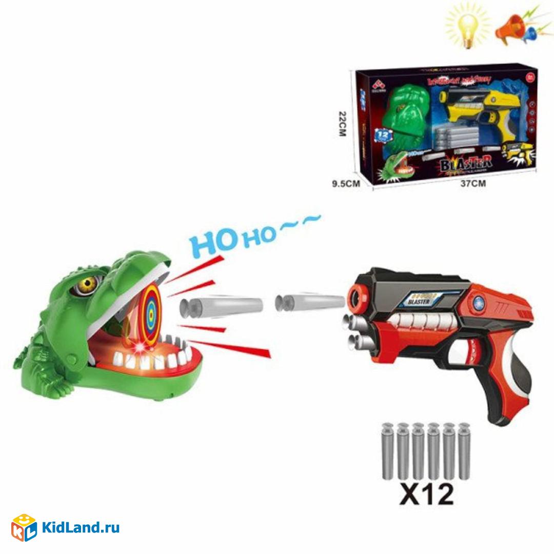 В комплект входят: бластер, 12 мягких пуль, классическая мишень (из картона), мишень в виде пасти животного.