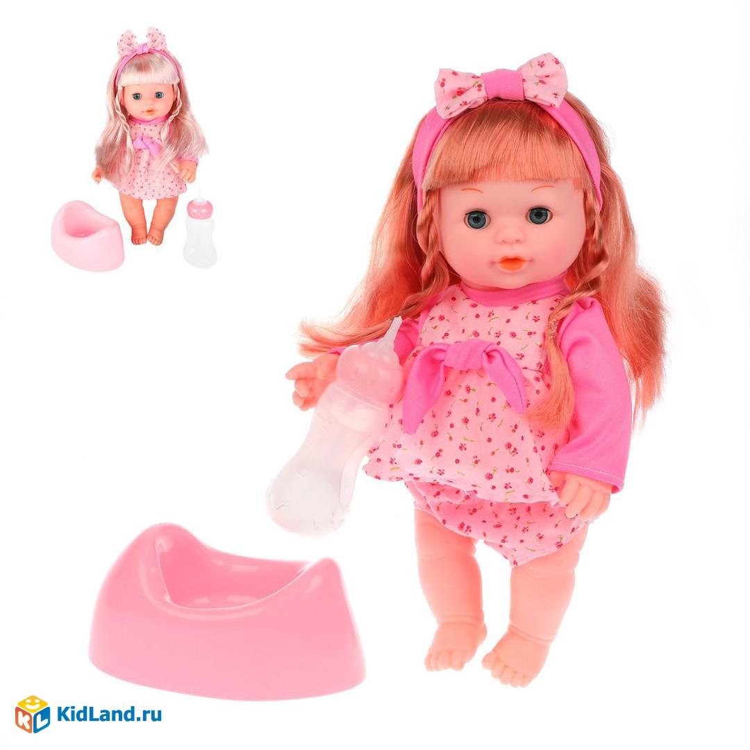 Озвученная кукла из набора "Мой малыш" представлена в ассортименте. У крохи твёрдое тельце, подвижные ручки, ножки и голова. Глазки открываются в положении «стоя» и закрываются в положении «лёжа». При нажатии на звуковое устройство, расположенное в животике, малышка будет воспроизводить реалистичные детские звуки: плакать, агукать, звать маму. В комплекте прилагаются аксессуары: бутылочка и горшок. Куклу можно напоить водой, и она пописает, как настоящий младенец.