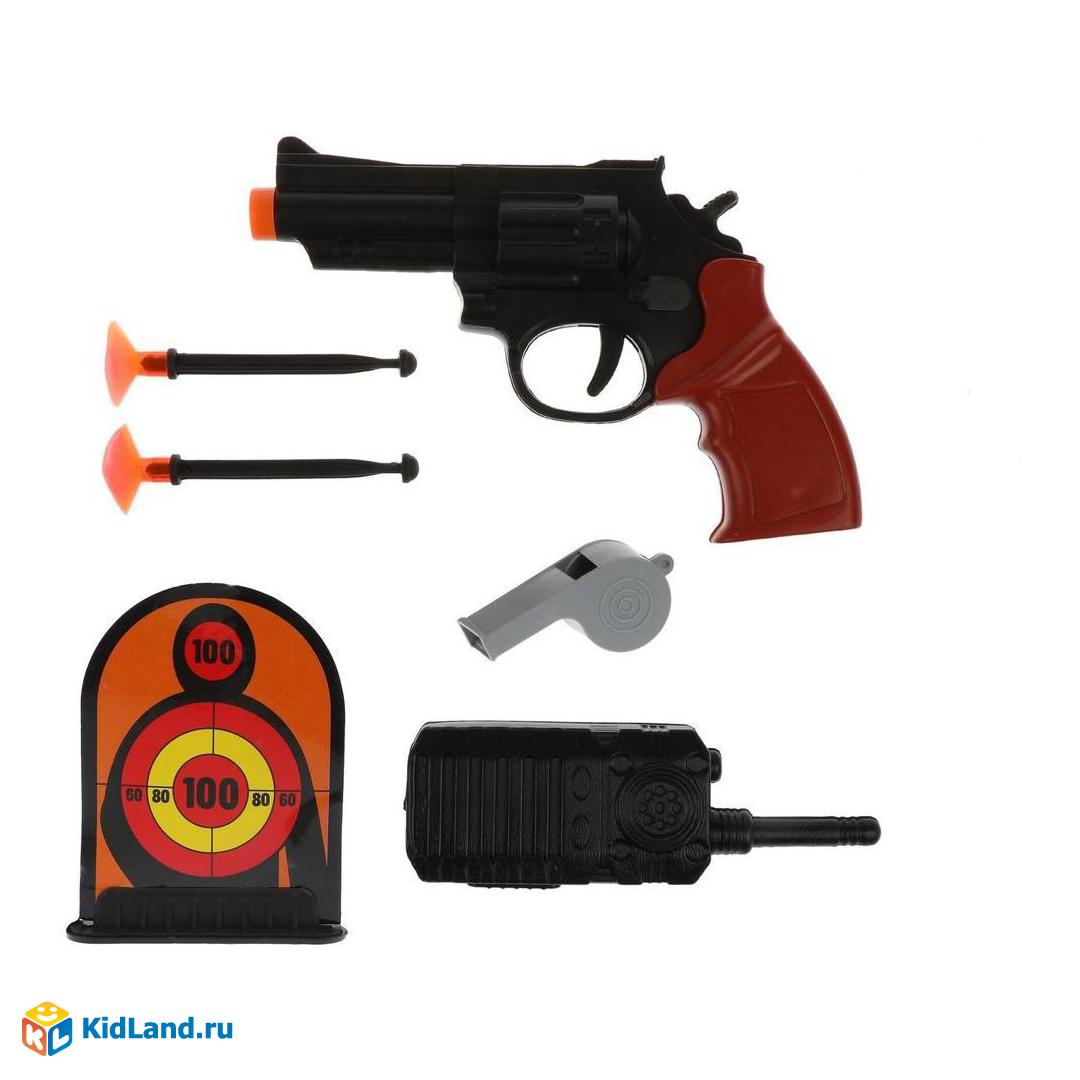 Игровой набор «Полиция» подарит мальчику много ярких эмоций и идей для увлекательной игры! В комплекте: револьвер, дротики на присосках (2 шт.), рация, мишень и свисток. Дротики поочерёдно устанавливаются в дуло игрушечного оружия, выстрел осуществляется нажатием на курок.
