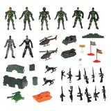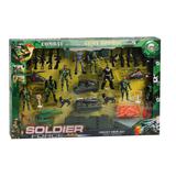 В комплекте – 8 подвижных фигурок солдатиков высотой 9 см, 2 фигурки животных, а также 10 автоматов, 6 машин военной техники длиной 8-10 и 6 сопутствующих аксессуаров.