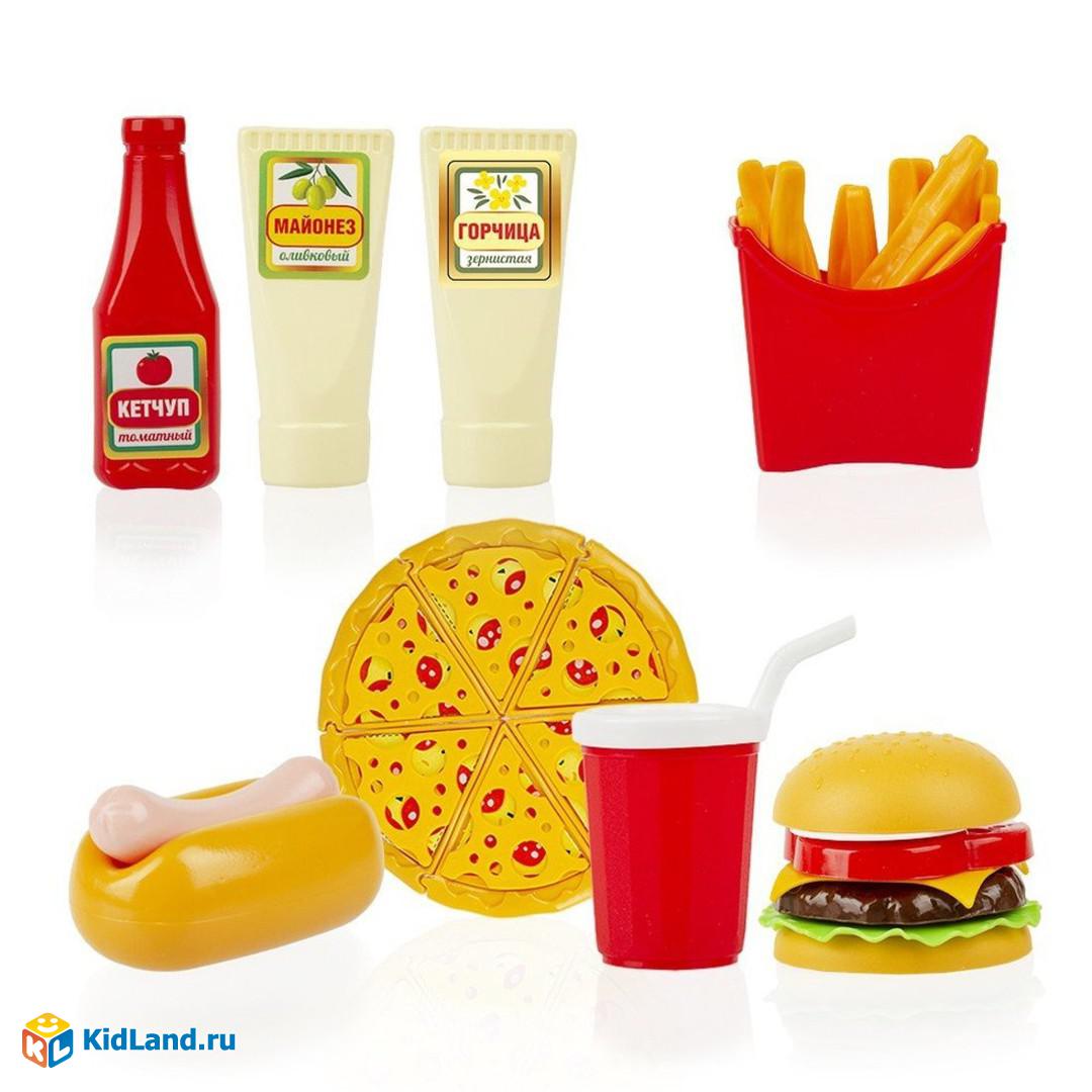 Игровой набор предназначен для сюжетно-ролевых игр, способствует развитию воображения. Играя, ребёнок развивает моторику рук и координацию движений, осваивает базовые социальные и бытовые навыки.Состав: бургер, хот дог, пицца, картофель фри, кетчуп, майонез, горчица, стакан с трубочкой.