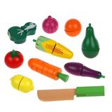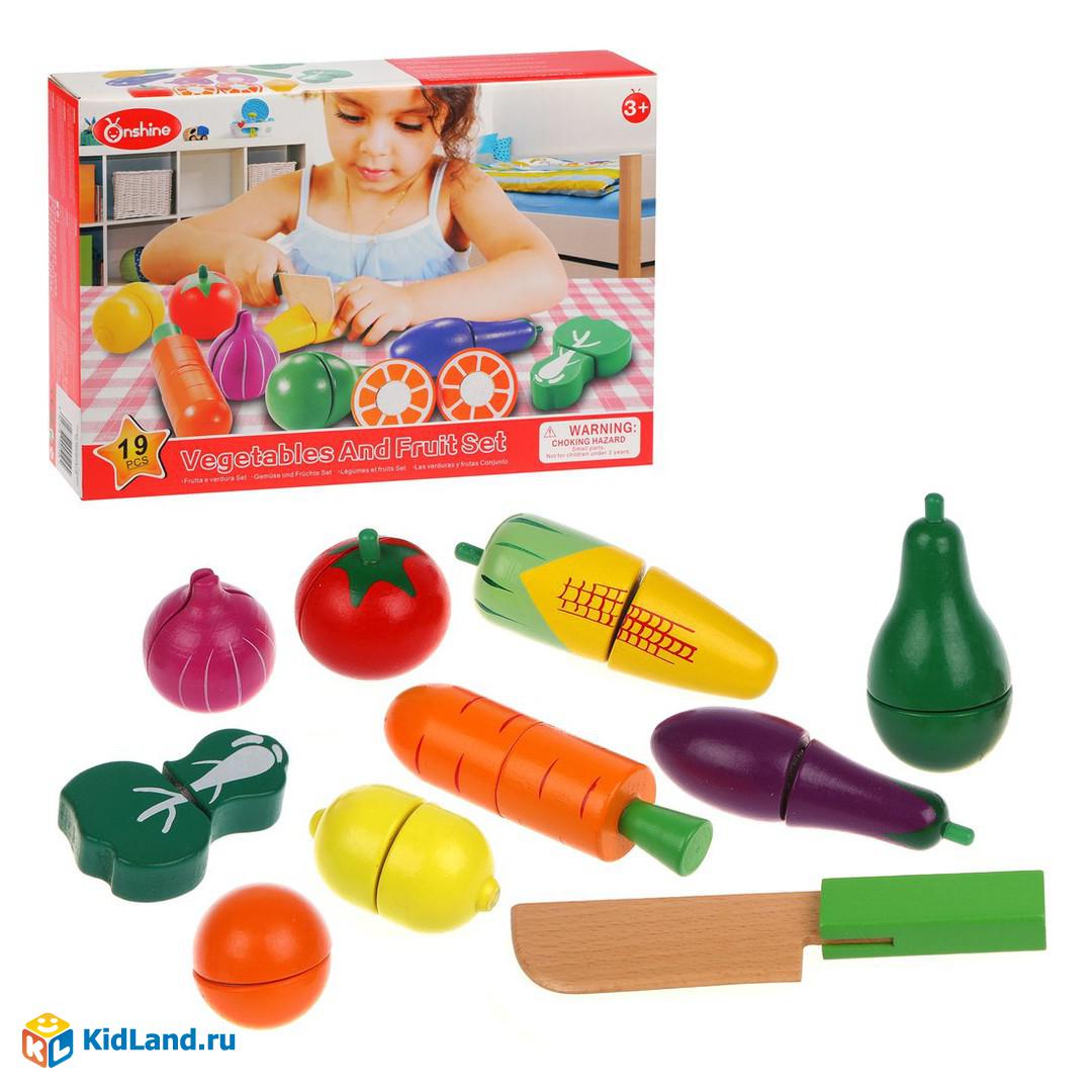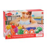 Игровой набор для резки «Овощи» включает 19 предметов: безопасный ножик и половинки помидора, кукурузы, капусты, моркови, баклажана, груши, лимона и апельсина. Части игрушечных продуктов можно разъединять при помощи ножика, а затем соединять обратно. Играя, ребёнок будет развивать мелкую моторику рук, тактильные ощущения, координацию движений и воображение.