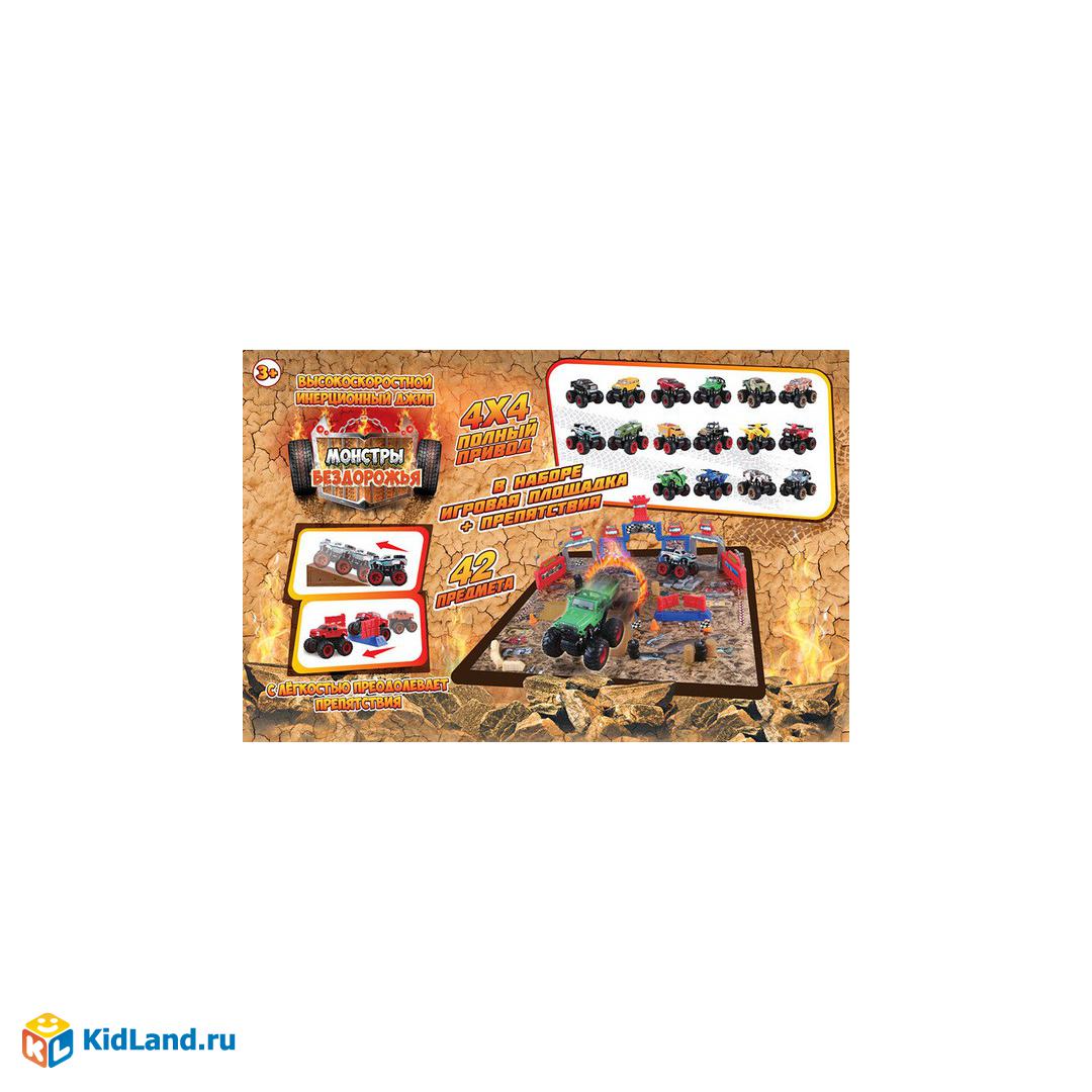 Монстры бездорожья. Джип высокоскоростной инерционный.4х4 полный привод, в наборе игровая площадка и препятствия, 42 предмета.Размер упаковки (д/ш/в): 45x12,5x30 см.Предназначено для детей в возрасте от 3-х лет.