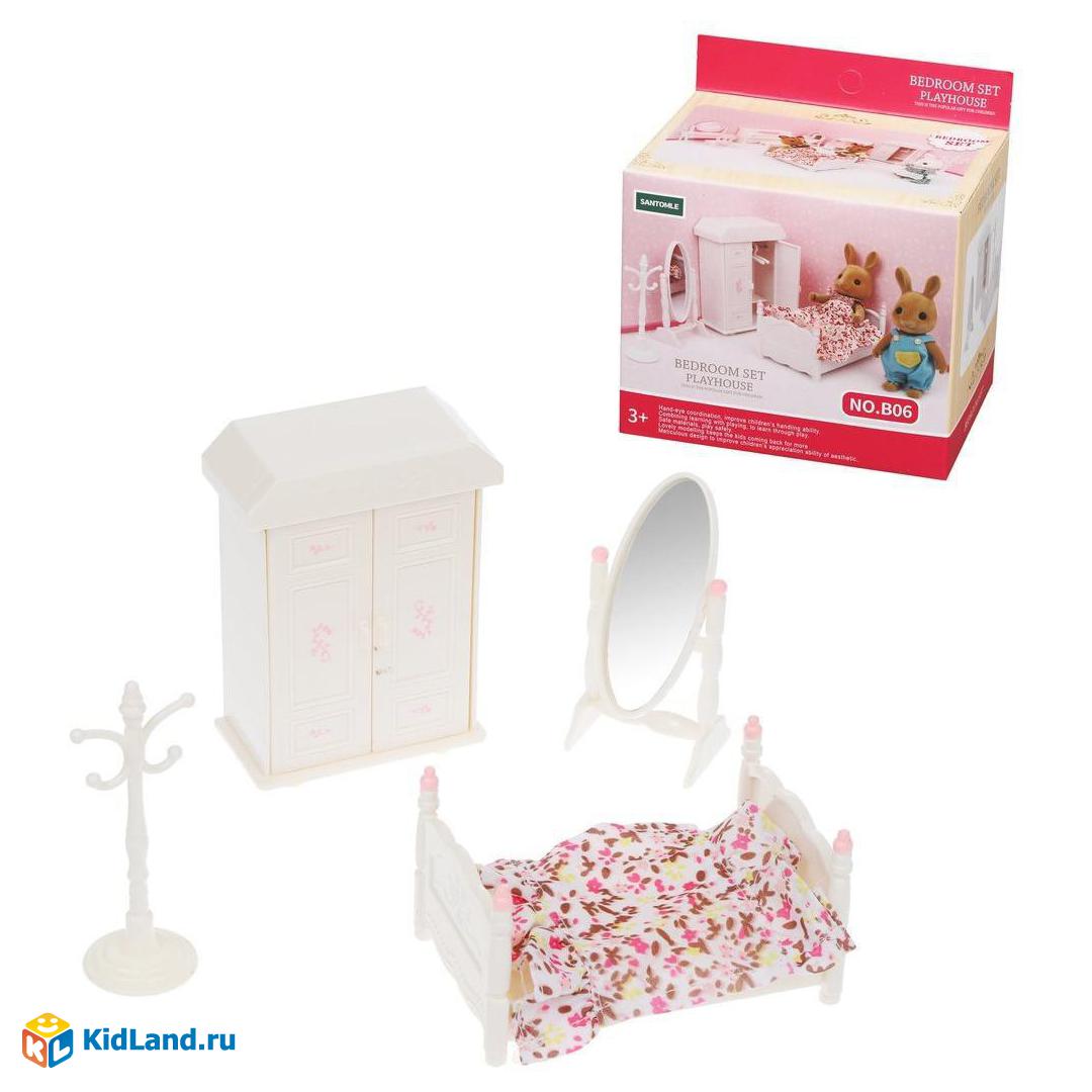 Игровой набор «Спальня» включает несколько предметов: кроватку с матрасиком и одеялом, шкафчик с открывающимися дверцами, напольное зеркало, напольную вешалку и 2 вешалки-плечики. Этой мебелью можно очень уютно обставить комнатку в кукольном доме!