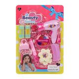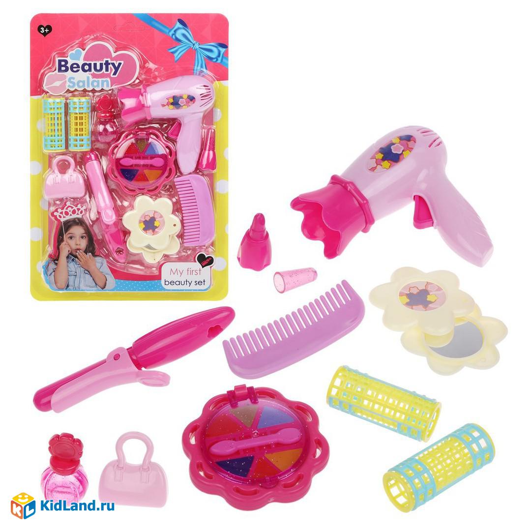 Игровой набор поможет девочке проявить фантазию и почувствовать себя в роли модного стилиста-визажиста. В комплекте есть фен, плойка, расчёска, зеркальце, две бигуди, муляж теней, муляж помады, флакончик и сумочка для куклы. Всего 10 предметов.