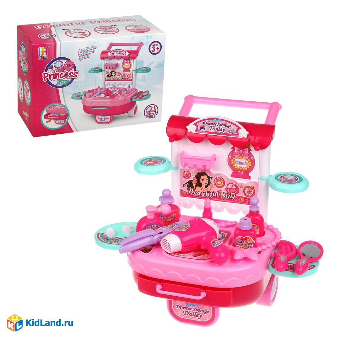 Игровой набор «Стилист» с аксессуарами станет приятным подарком для каждой маленькой модницы. В комплект входят следующие предметы: 1 модный туалетный столик на колёсиках, 4 флакончика, 1 фен, 1 плойка, 1 муляж помады, 2 колечка, 1 колье, 1 зеркальце и 1 расчёска. Набор также включает 1 лист с декоративными наклейками.