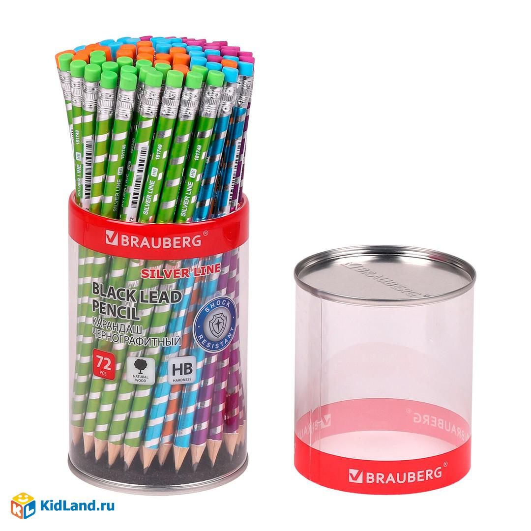 Карандаш чернографитный BRAUBERG "SILVER LINE", 1 шт, HB, с ластиком, корпус ассорти, 181749