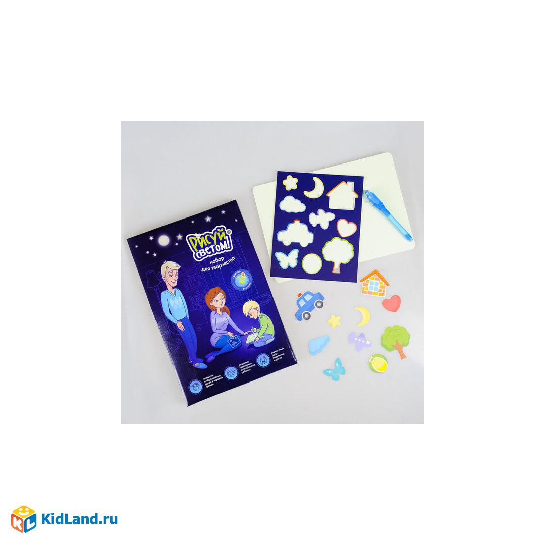 Планшет для рисования светом в темноте. Создавайте сюжеты и рисуйте картины, светящиеся в темноте, с помощью специального маркера и планшета. Максимальной яркостью свечения 5-15 минут и плавным затуханием в течении 1,5 часов - 2.5 ч.Комплектномть: коробка, планшет, ручка,1 трафарет, инструкция