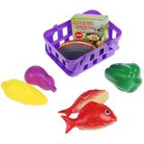 В наборе - 20 аксессуаров: 1 касса, 1 терминал для карты, 1 корзинка для продуктов, 2 рыбы, 1 консервы, 1 баклажан, 1 перец, 1 кукуруза, 1 коробочка с изображением продуктов, 1 банковская карта, 6 монет, 3 купюры.