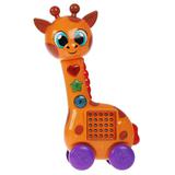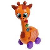 Ребёнок с удовольствием будет играть с этой занимательной игрушкой, выполненной в виде очаровательного жирафа с головой, издающей звуки трещотки. Играя с жирафом, малыш услышит добрые и весёлые песенки из известных мультфильмов и стихотворения о цифрах. Благодаря подвижным колёсам игрушку можно возить как каталку.