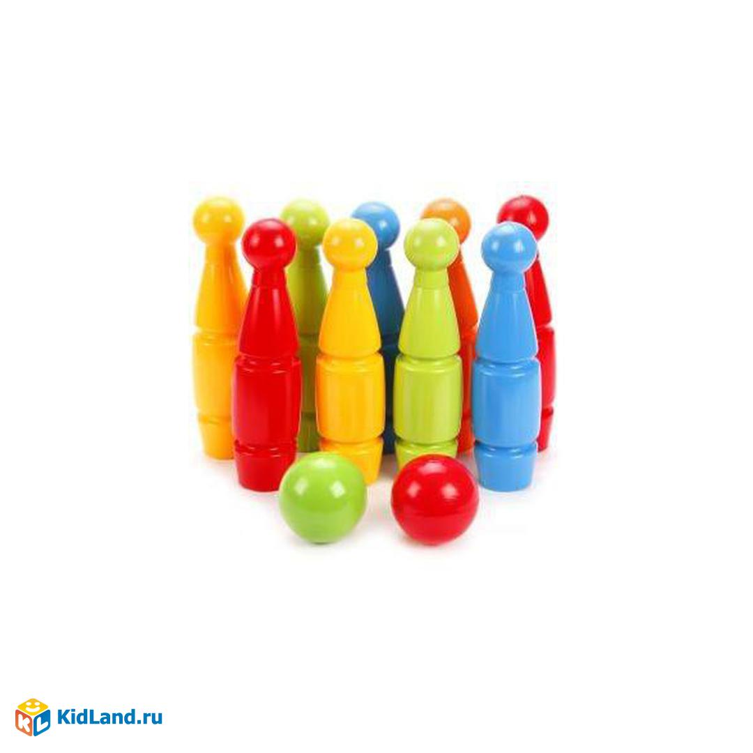 В набор для игры в боулинг входят девять разноцветных кеглей и два шара. Такой комплект хорошо подойдет для игр на природе, но и дома с ним тоже можно играть, поскольку все изделия достаточно легкие и безопасные в использовании: ребёнок не повредится сам и ничего не разобьет деталями из набора. Кроме того, шары и кегли выполнены из высококачественной безопасной пластмассы. Рекомендованный возраст: 3 года +