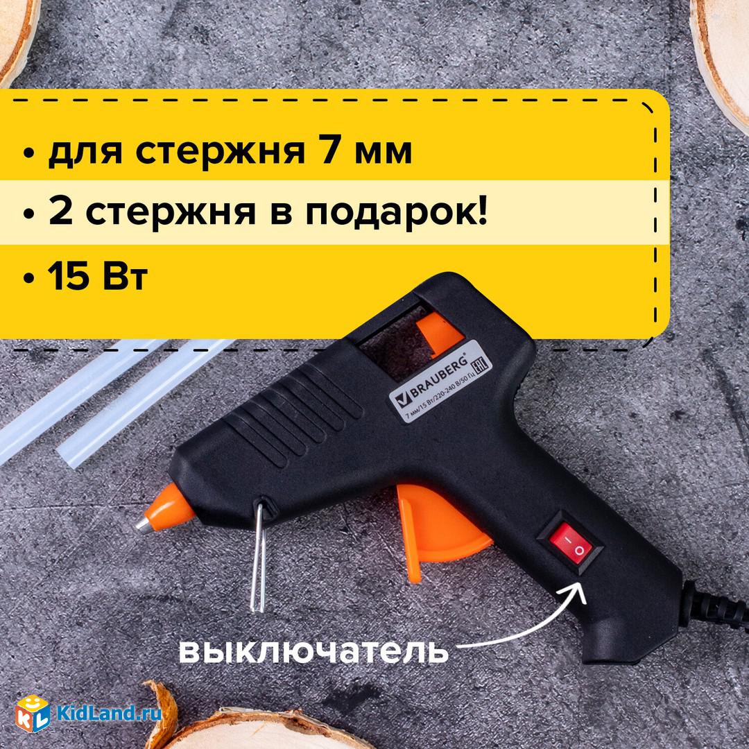 Клеевой пистолет 15 Вт для стержня 7 мм, с выключателем, BRAUBERG, в блистере, 671051