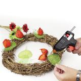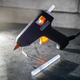 С его помощью можно склеить дерево, пластик, резину, кожу, стекло, металл, ткань, пенопласт, керамику, картон, бумагу, цветы и проч. Заправляется специальным клеевым стержнем диаметром 7 мм. Пистолет клеевой мощностью 15 Вт работает от сети. Производительность 6 г/мин обеспечивает непрерывную подачу клея. Рабочая температура пистолета: 130-272 градусов. 2 клеевых стержня в комплекте. Корпус изготовлен из ударопрочной пластмассы и имеет скобу для надежной установки в нерабочем положении. Используется малый клеевой пистолет в основном в быту, там где нужно что-то подклеить в небольшом объеме, например, для декорирования или изготовления упаковочной и сувенирной продукции. Удобен для работы с малогабаритными изделиями. Принцип работы: клеевой стержень плавится в металлической камере с помощью нагревательного устройства, а при нажатии на курок происходит дозирование, и клей подаётся из сопла на склеиваемую поверхность.