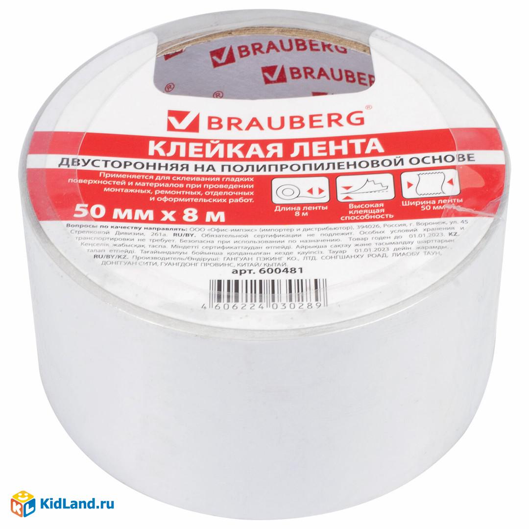 Клейкая двухсторонняя лента 50мм х 8м, ПОЛИПРОПИЛЕНОВАЯ ОСНОВА, 90 микрон, BRAUBERG, 600481