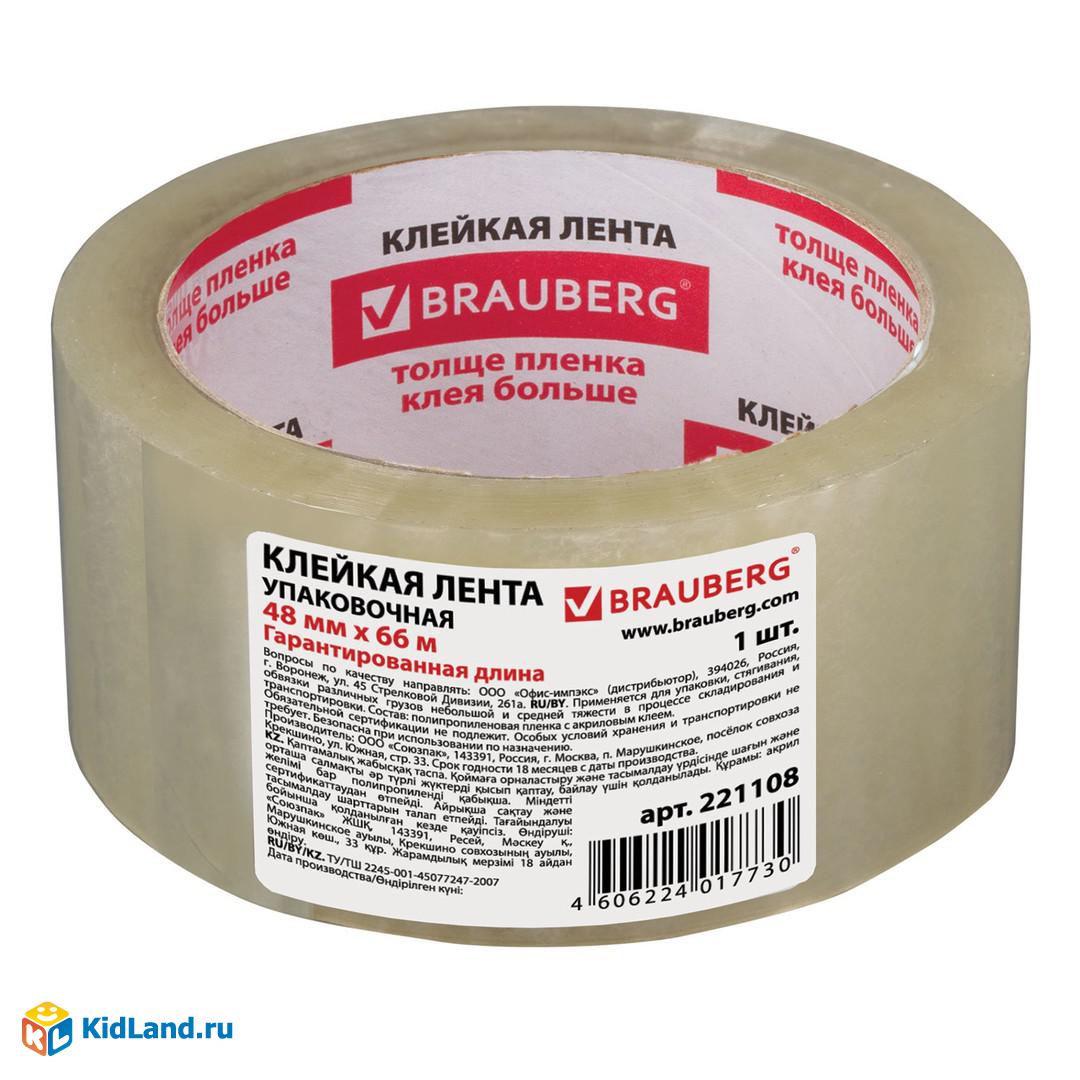 Клейкая лента упаковочная 48мм х 66м, прозрачная, толщина 45 микрон, BRAUBERG, 221108