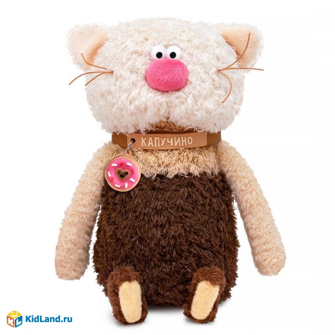 Шикарный кот Капучино из тактильно приятного эко меха в трех оттенках: шоколадного, кремового и молочного цвета. Лапки и хвостик из более короткого меха. Усики из шелковистого крученого шнура. Объемный носик обтянут розовым софтом. Глазки из пластика. Пяточки из софта цвета крема, а внутри ушек софт сливочного цвета. На шейке у кота силиконовый чокер с именем и подвесом в виде пончика с розовой помадкой и посыпкой сверху. Чокер легко снимается и может послужить в качестве модного браслета для друга.