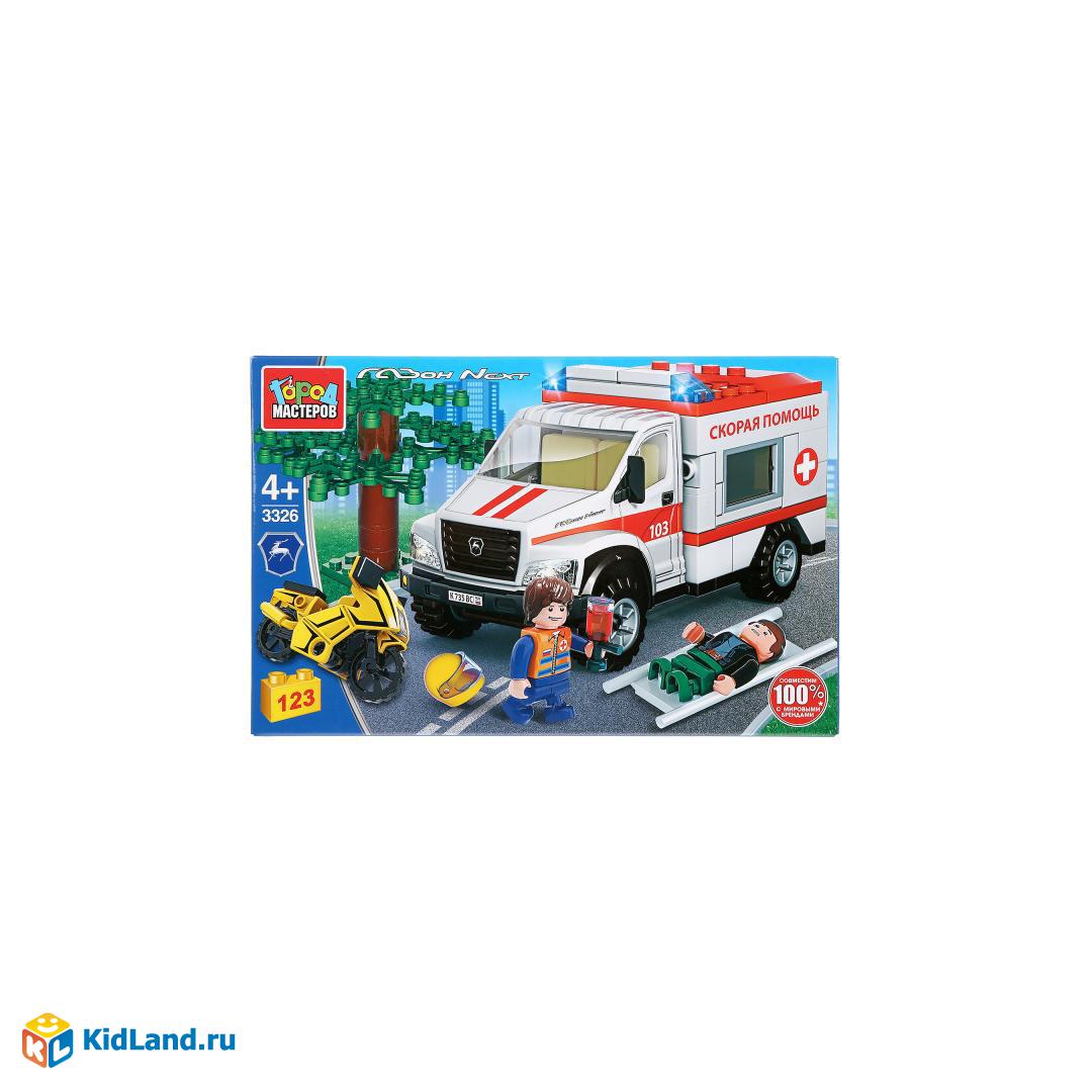 Конструктор "Город мастеров" газ некст:авария с мотоциклистом, с фигурками,123дет. кор.