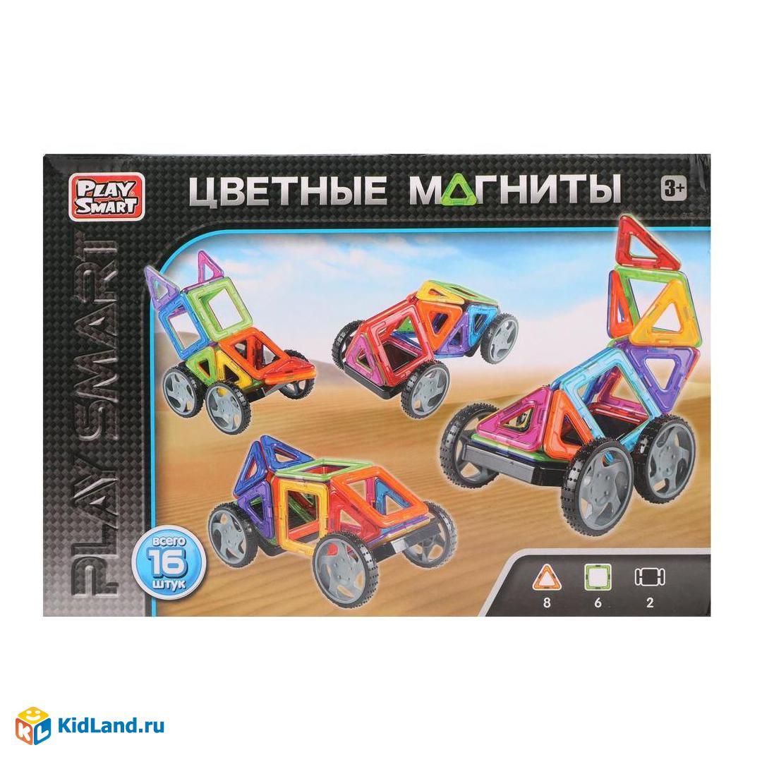 В наборе - 16 деталей, из них 14 элементов со встроенными магнитами и 2 платформы с колёсиками. Материал изготовления: пластмасса. Рекомендованный возраст: 3 года +