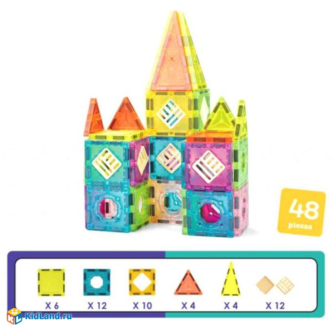 В магнитном конструкторе – 48 элементов: 36 магнитная деталь, 12 пластиковых элементов.