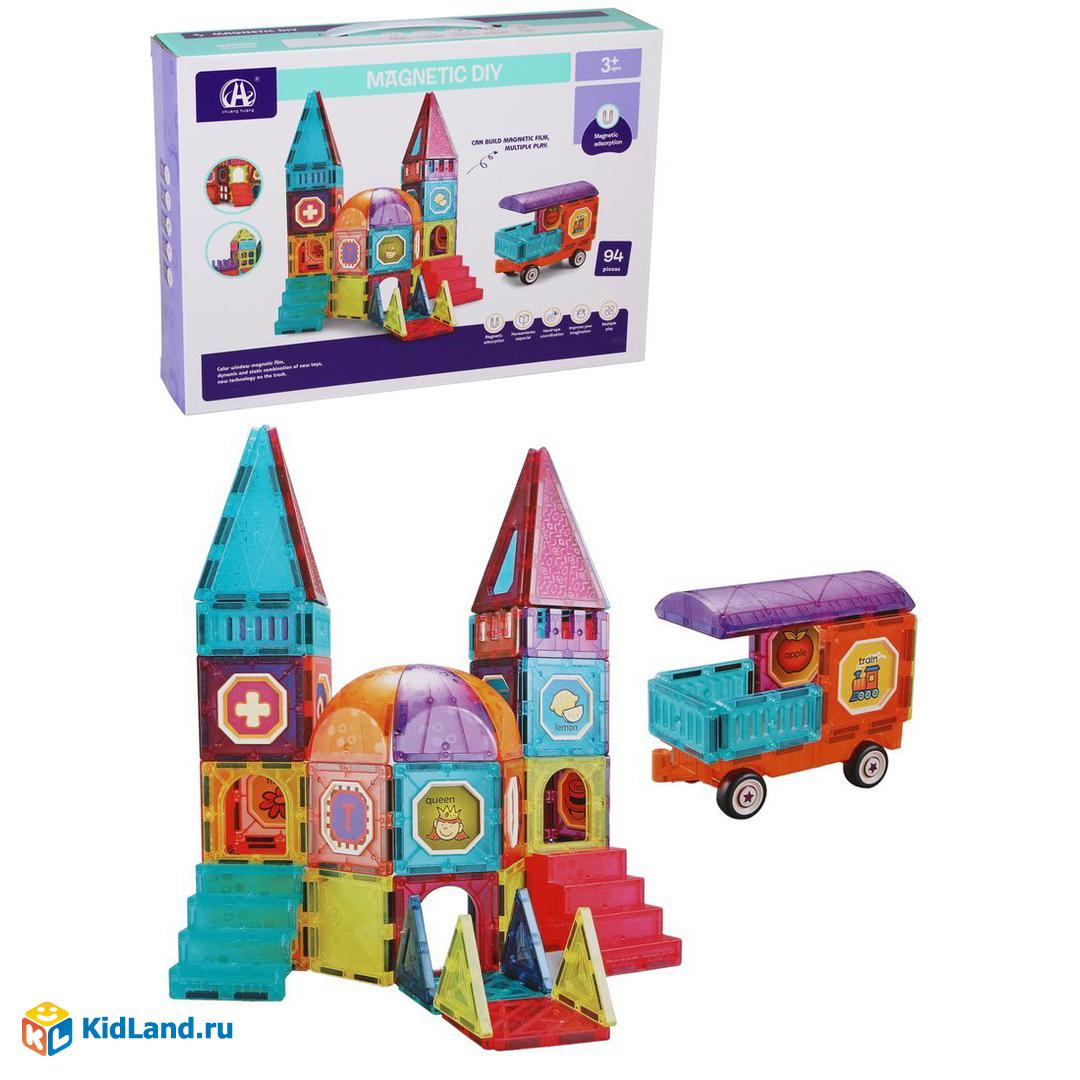 Конструктор состоит из 94-х магнитных разноцветных пластиковых деталей в виде различных плоских геометрических фигур для сборки объемных конструкций.