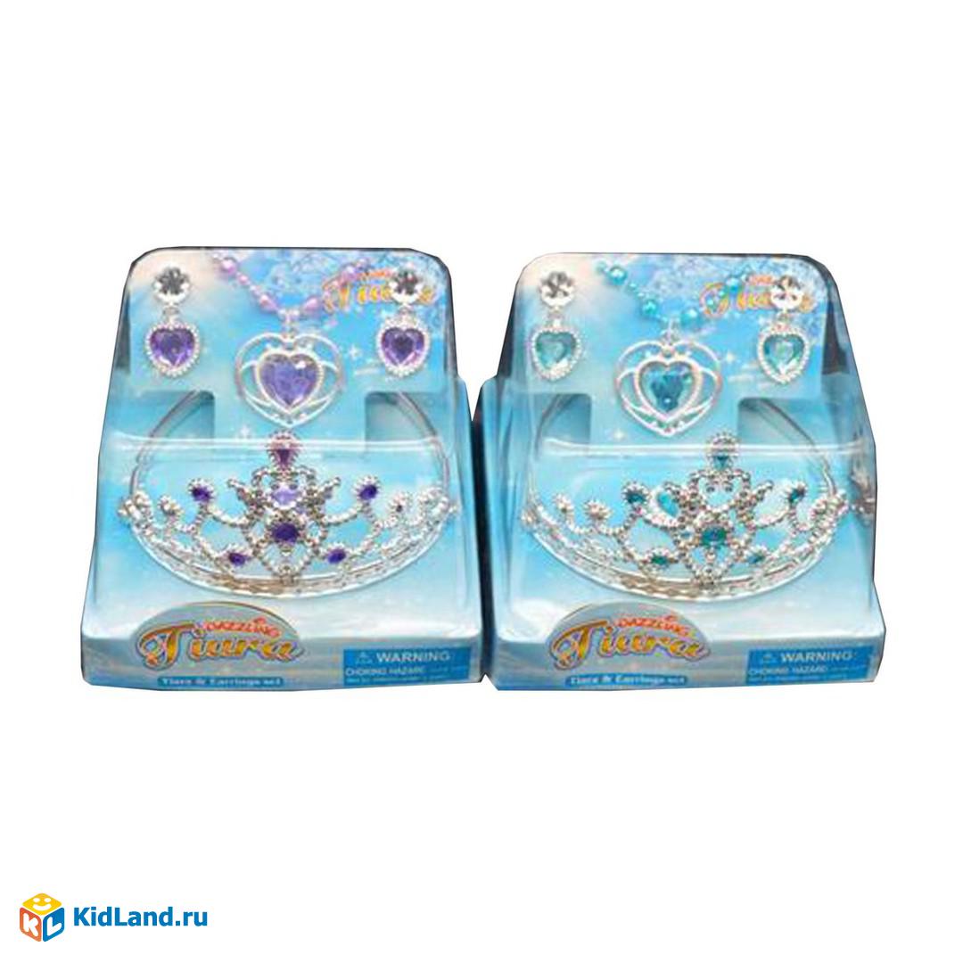 Набор украшений для девочек включает прекрасную корону, колье и серьги-клипсы. Все изделия украшены сверкающими камнями. Аксессуары станут великолепным дополнением к образу девочки на празднике.