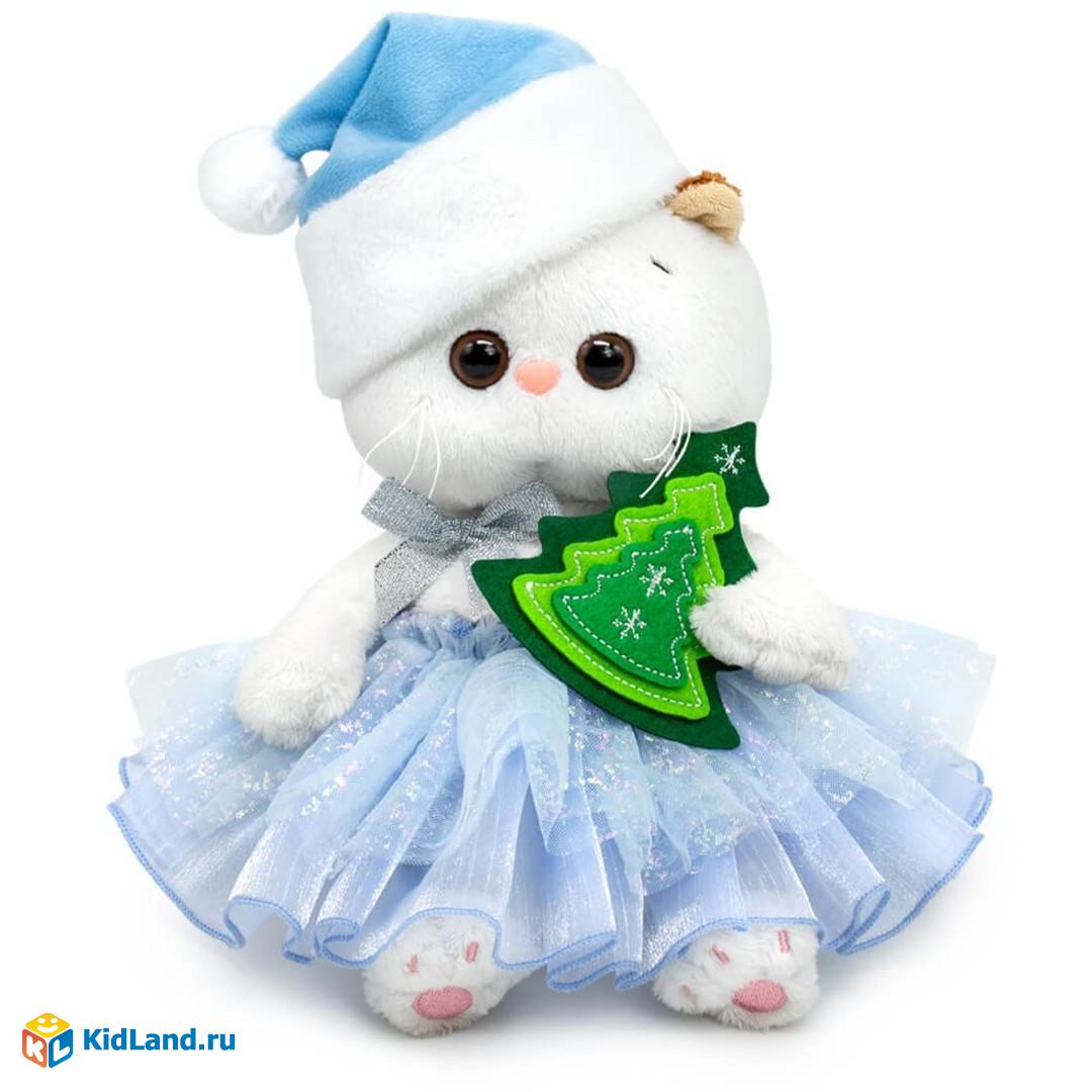 Малышка Лиличка в новогоднем костюмчике. Пышная юбочка сшита из двух видов органзы ледяного голубого цвета с деликатным серебристым блеском. Сбоку на шее Ли‑Ли маленький нежно‑голубой бантик с люрексом. На голове у кошечки новогодний колпачок из голубого софта с белоснежным меховым отворотом и белым помпоном на конце. В лапке у Ли‑Ли милая ёлочка из фетра с вышивкой.