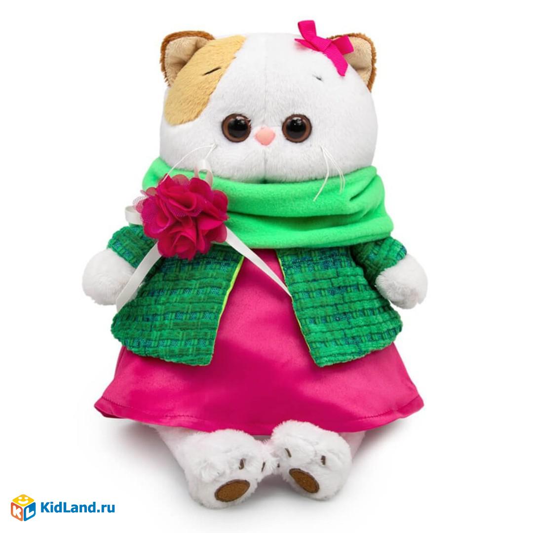 Ли-Ли в ярком комплекте. Зеленая курточка из флоковой фактурной ткани, ярко‑розовый сарафан из шелковистого крепа, мягкий снуд из флиса цвета весеннего букета. Снуд украшен объемным цветком на банте из атласной ленты молочного цвета. Игрушка поставляется в закрытой подарочной коробке, подвязанной атласными лентами.