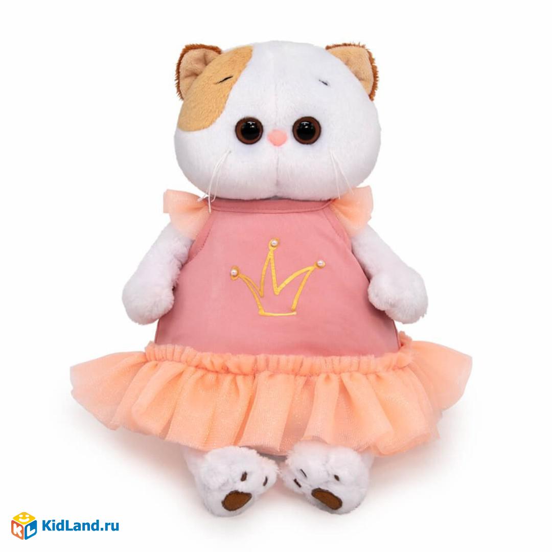 Ли-Ли принцесса в очаровательном платье из плотного х/б трикотажа персикового цвета с крылышками и оборочкой из сеточки цвета абрикосового крема. Платье спереди украшает термонаклейка в виде золотой короны с жемчужинками. Игрушка поставляется в закрытой подарочной коробке, подвязанной атласными лентами.