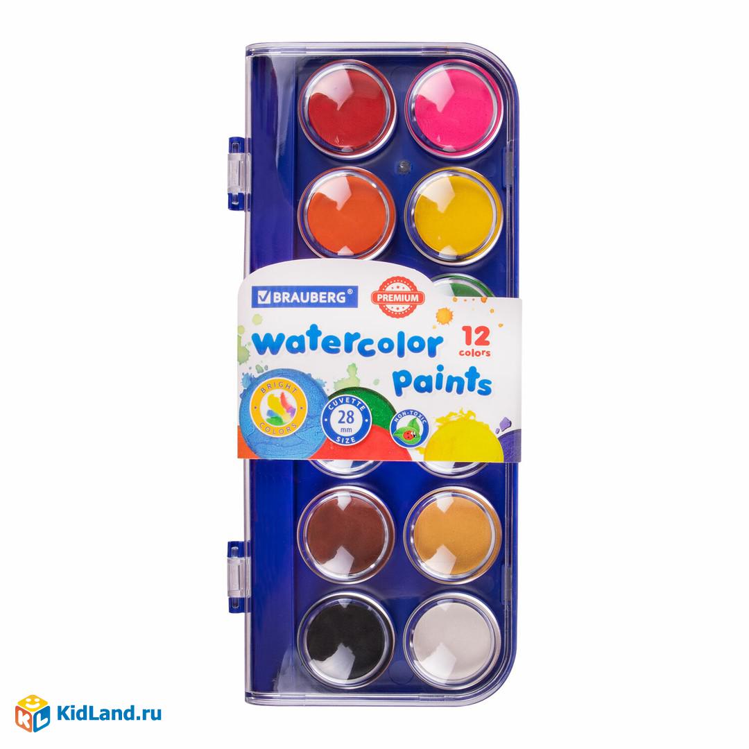 Краски акварельные BRAUBERG "PREMIUM" 12 цветов, круглые кюветы 28 мм, пенал, 191743