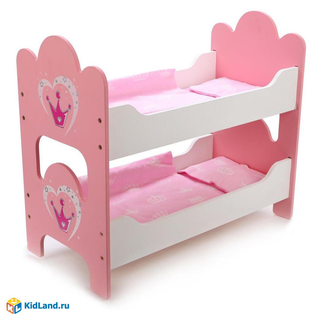 Кукольная двухъярусная кроватка «Корона» сделана из экологически чистого материала — дерева (МДФ плиты). Все детали тщательно отшлифованы — игрушка безопасна для здоровья. Длина каждого спального места — 51 см, кроватка подходит для большинства кукол-младенцев. Кроватка укомплектована постельным бельем: матрасом, подушкой и одеялом.
