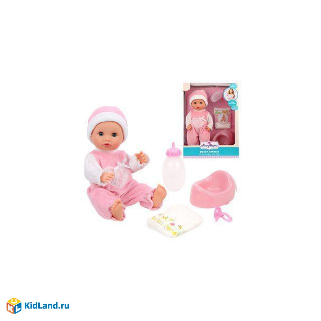 Кукла Мэри из коллекции "Уроки заботы" внешне очень похожа на настоящего малыша! И так же, как и каждому маленькому ребёнку, ей очень нужны внимание, любовь и забота. Эта милая девочка очень послушная: её легко приучить к гигиене, достаточно напоить куколку из бутылочки водой, а затем посадить на розовый горшок. У малышки твёрдое тельце, её можно купать. Глазки закрываются в положении «лёжа» и открываются в положениях «стоя» и «сидя».