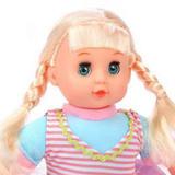 Мягконабивная куколка одета в милое сиреневое платьице. У малышки мягкие ножки и тельце, твёрдые ручки и голова. Глазки открываются в положении «стоя» и закрываются в положении «лёжа».