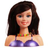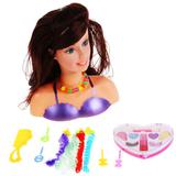Игрушка представляет собой кукольную голову из мягкого материала с длинными волосами тёмного цвета, которые легко расчёсываются. Кукольное лицо детально прорисовано, на фигуре нарисовано фиолетовое платье. Игрушка станет отличным дополнением к сюжетно-ролевым играм в салон красоты. С помощью входящих в набор аксессуаров можно научиться укладывать волосы, создавать свои стильные причёски и наносить на лицо макияж.